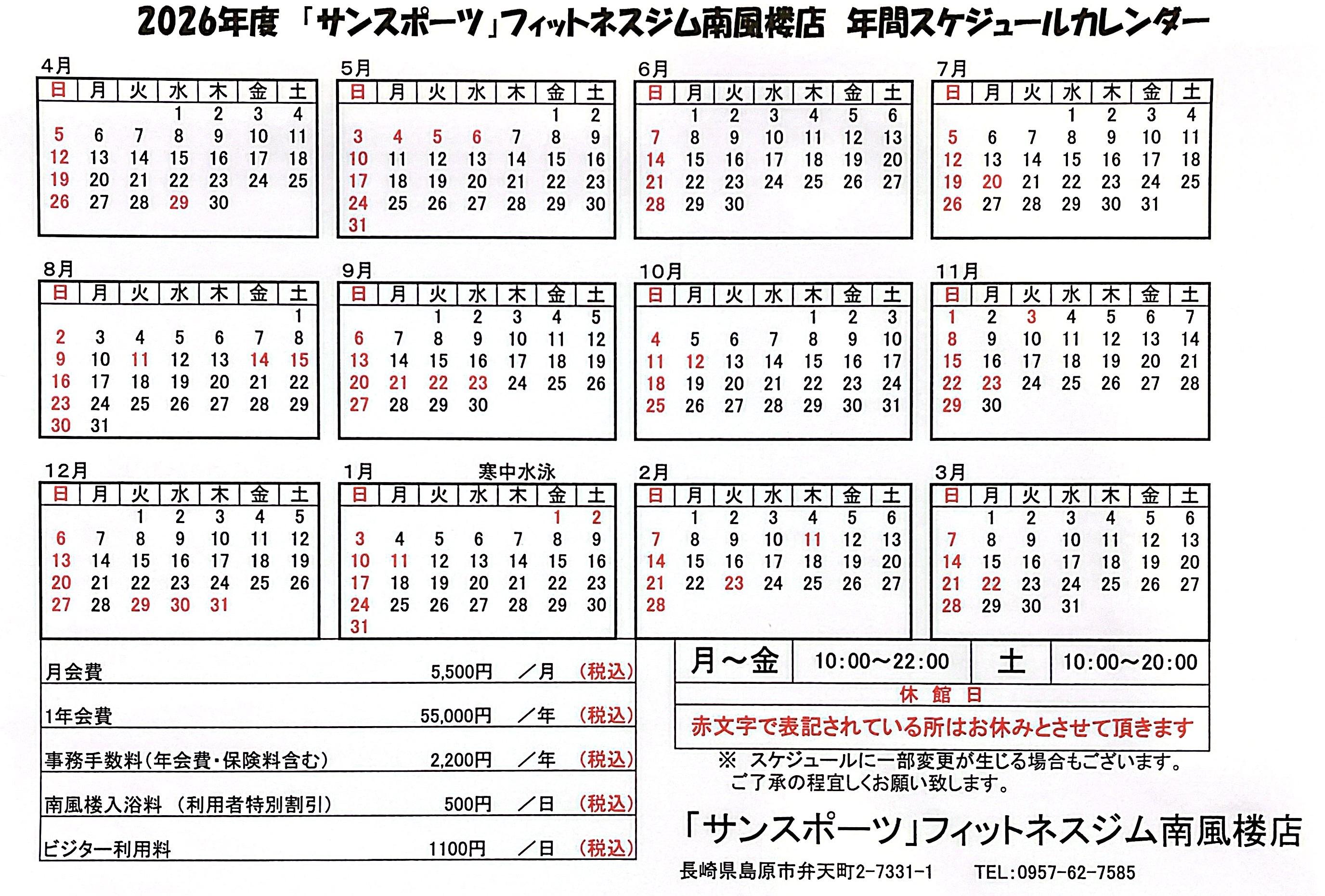 4月度大浴場カレンダー
